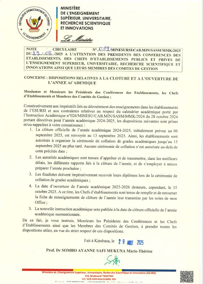 La loi et les instructions académiques en République Démocratique du Congo exigent des Établissements Publics, ou Privés agréés de remettre...