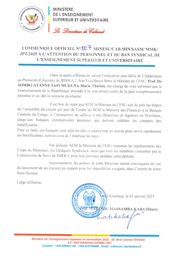 Son Excellence la Ministre de l’ESU informe que le Gouvernement de la République procède à la couverture totale de la paie complémentaire attendue et ce, dès la semaine prochaine.