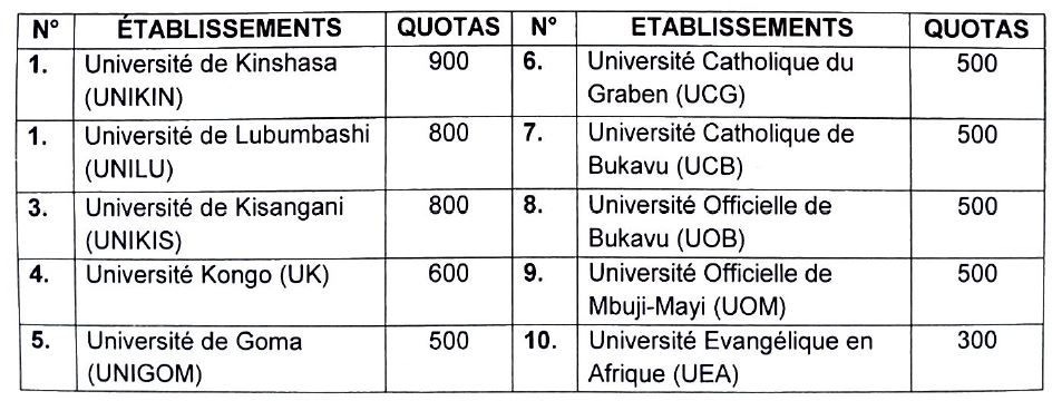 A cet effet, le Tableau 1 : Répartition des quotas d’inscription pour la Première Licence Médecine, année académique 2022-2023, est revu comme suite :